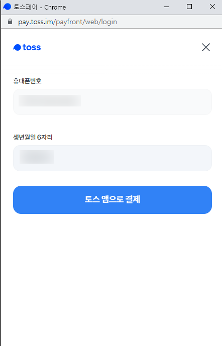 우선 온라인 쇼핑몰에서 토스페이먼츠로 결제하기를 누르면 위와 같은 팝업 창이 뜹니다.