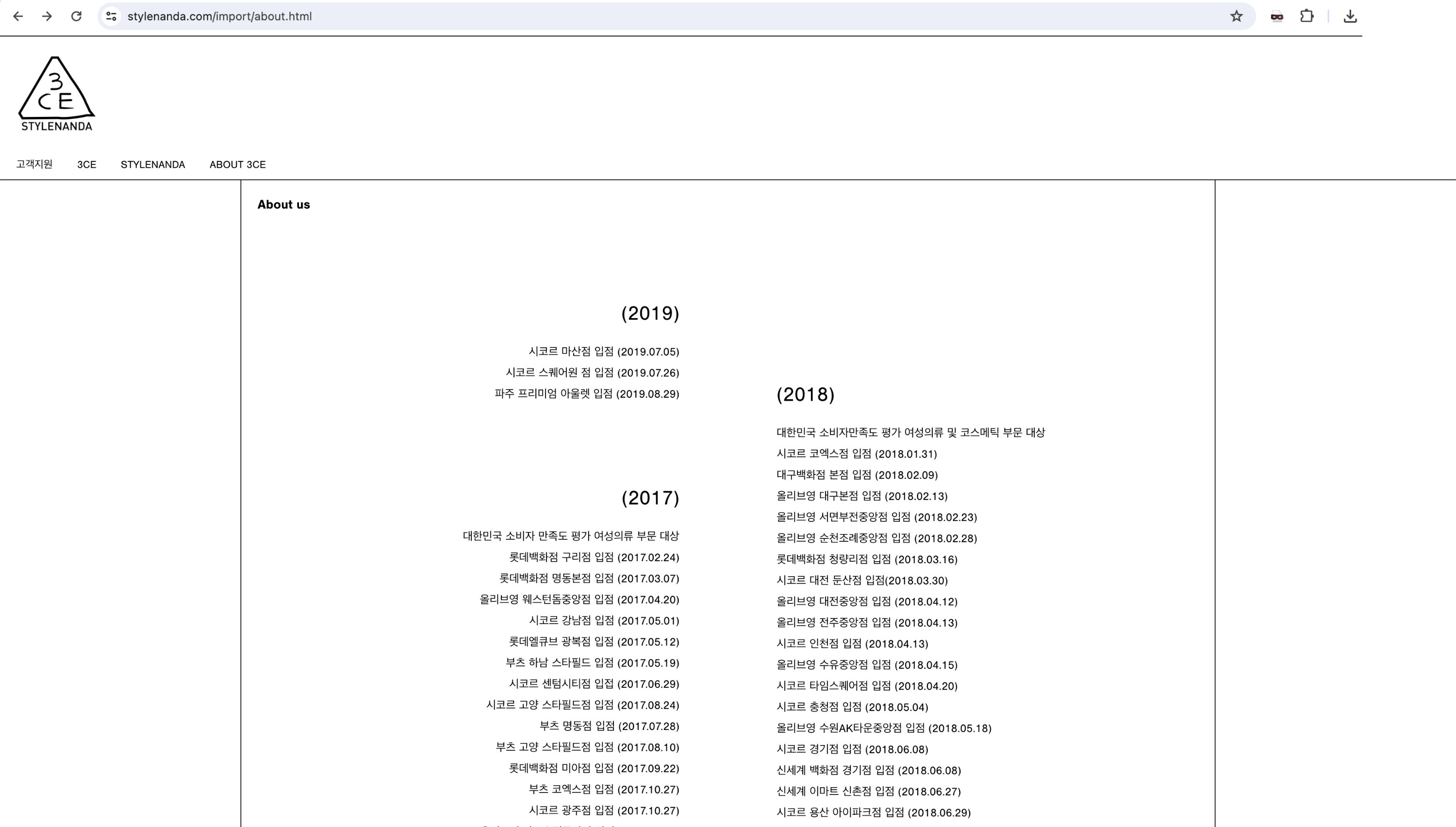 반면 스타일난다 공식몰의 브랜드 소개 페이지 URL은 끝이 .html로 끝나는 것을 확인할 수 있습니다.